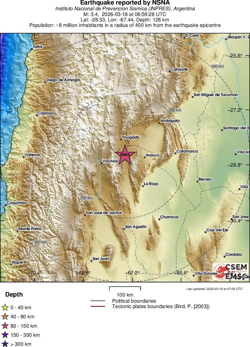 | 3.4 | 126 | 11555 | 07:59 | Link | Geringer Erdbeben - LA RIOJA, ARGENTINA - Heute |