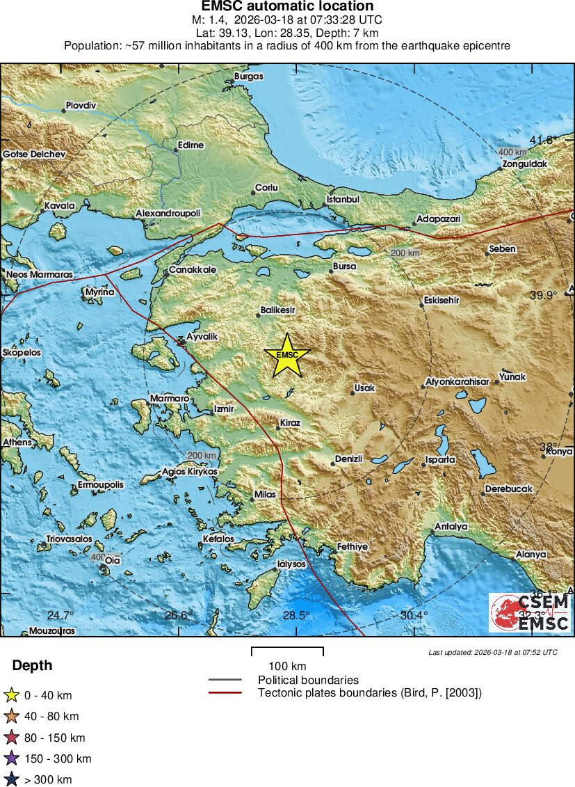 | 1.4 | 7 | 1706 | 08:33 | Link | Geringer Erdbeben - WESTERN TURKEY - Heute |
