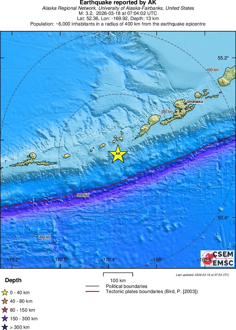 | 3.2 | 13.3 | 8831 | 08:04 | Link | Geringer Erdbeben - FOX ISLANDS, ALEUTIAN ISLANDS - Heute |