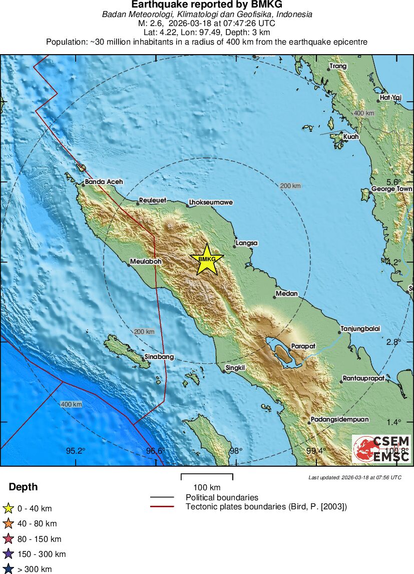 | 2.6 | 3 | 9385 | 08:47 | Link | Geringer Erdbeben - NORTHERN SUMATRA, INDONESIA - Heute |