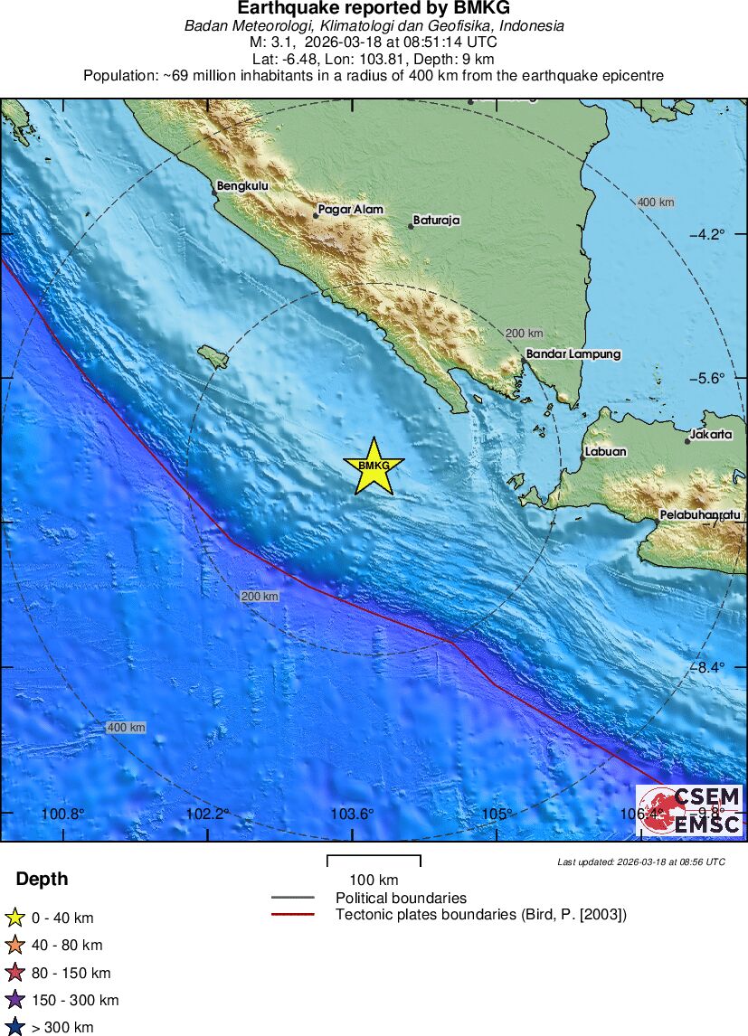 | 3.1 | 9 | 10739 | 09:51 | Link | Geringer Erdbeben - SOUTHWEST OF SUMATRA, INDONESIA - Heute |