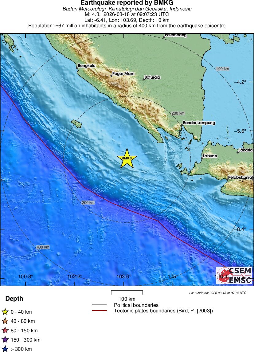 | 4.3 | 10 | 10725 | 10:07 | Link | Leichtes Erdbeben - SOUTHWEST OF SUMATRA, INDONESIA - Heute |